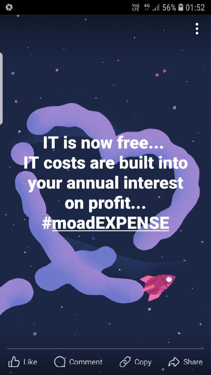 IT is now free... IT costs are built into your annual interest on profit... #moadEXPENSE...