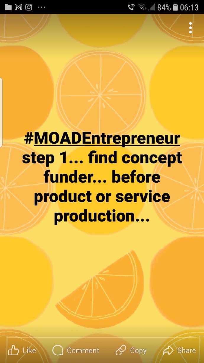 #moadENTREPRENEUR step 1... find concept funder... before product or service production...