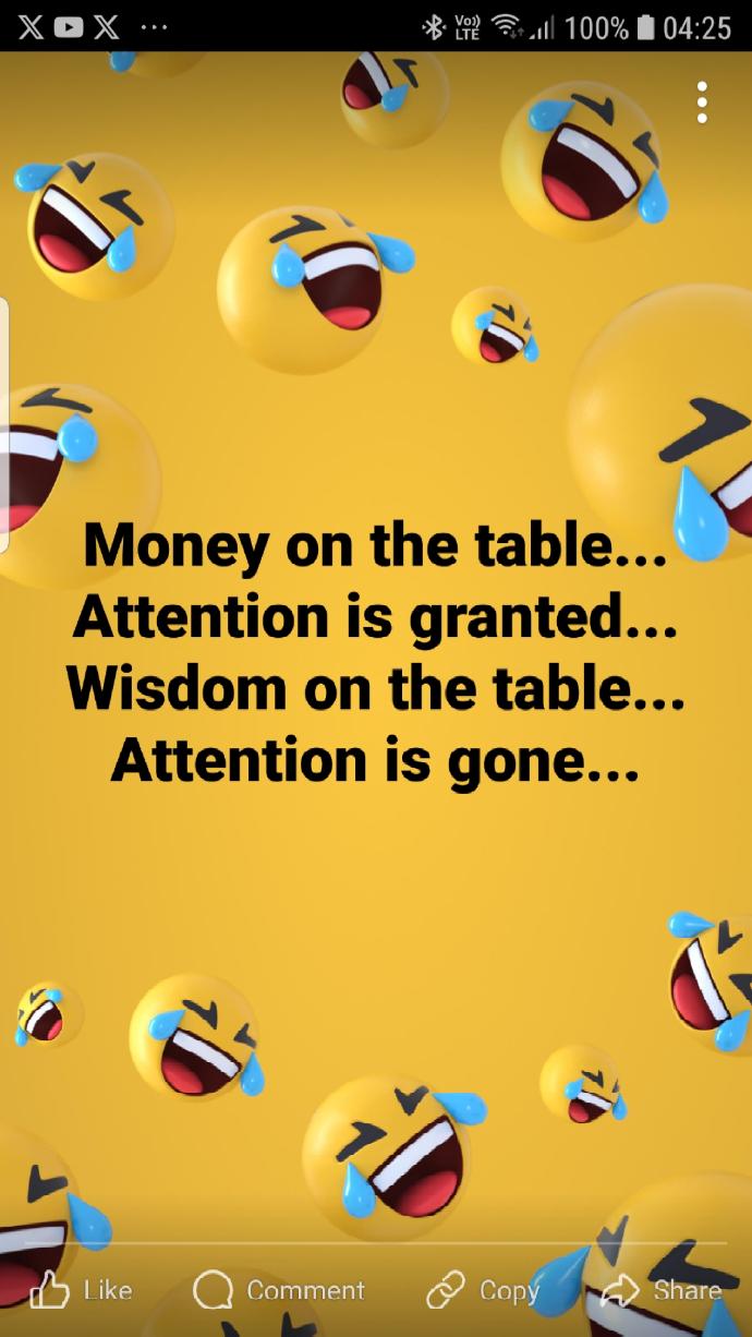 Money on the table... Attention is granted... Wisdom on the table... Attention is gone...