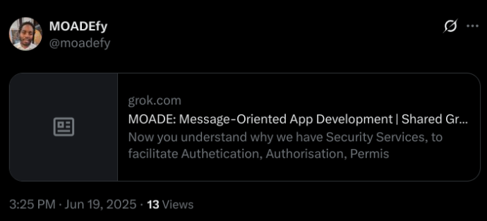 19 June 2025... You can now follow (at https://x.com/moadefy) and participate in our MOADE Operating System development with Grok at https://grok.com/share/bGVnYWN5_786db88a-08cc-421d-bd06-ee789c021586...